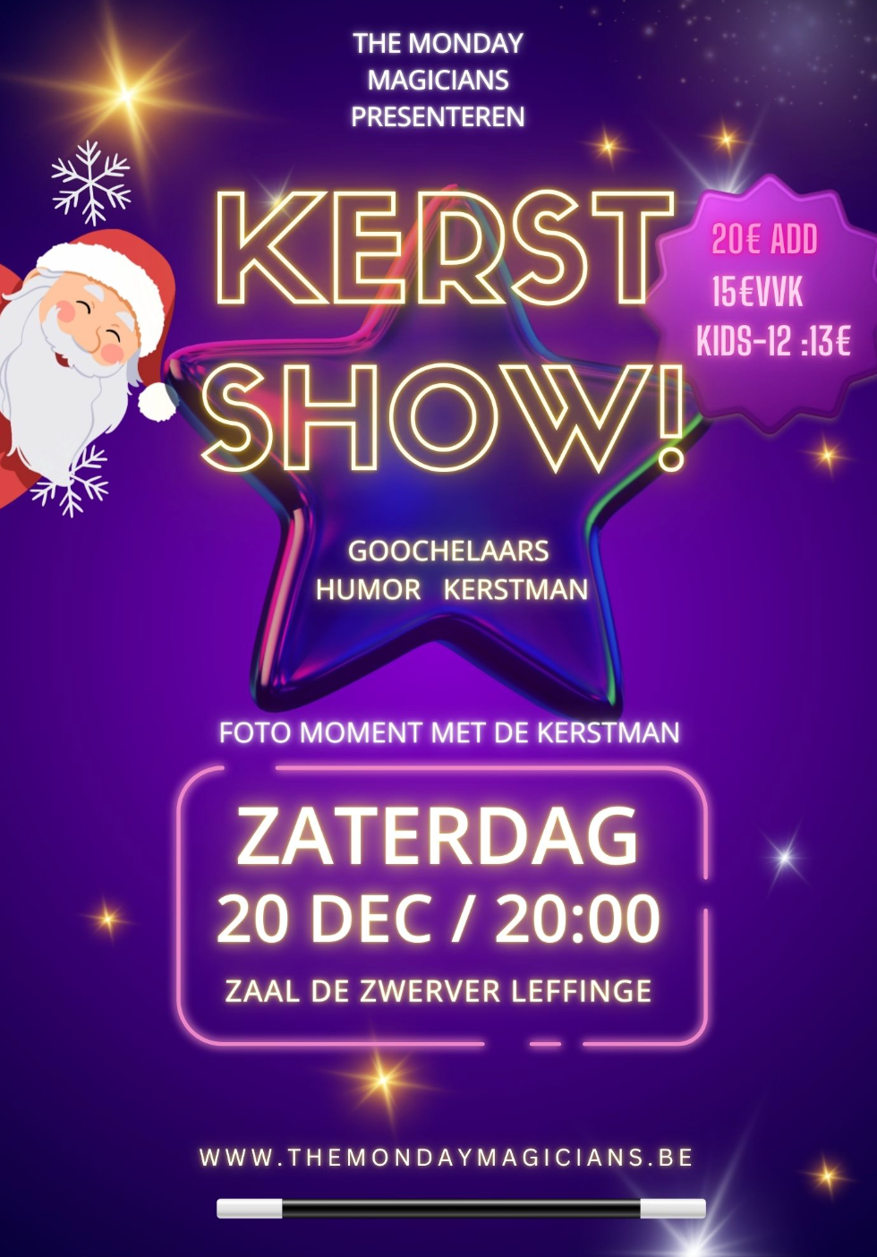 Le samedi 20 décembre à 20h00, The Monday Magicians vous invitent à un spectacle de Noël magique à la Salle De Zwerver, Leffinge.