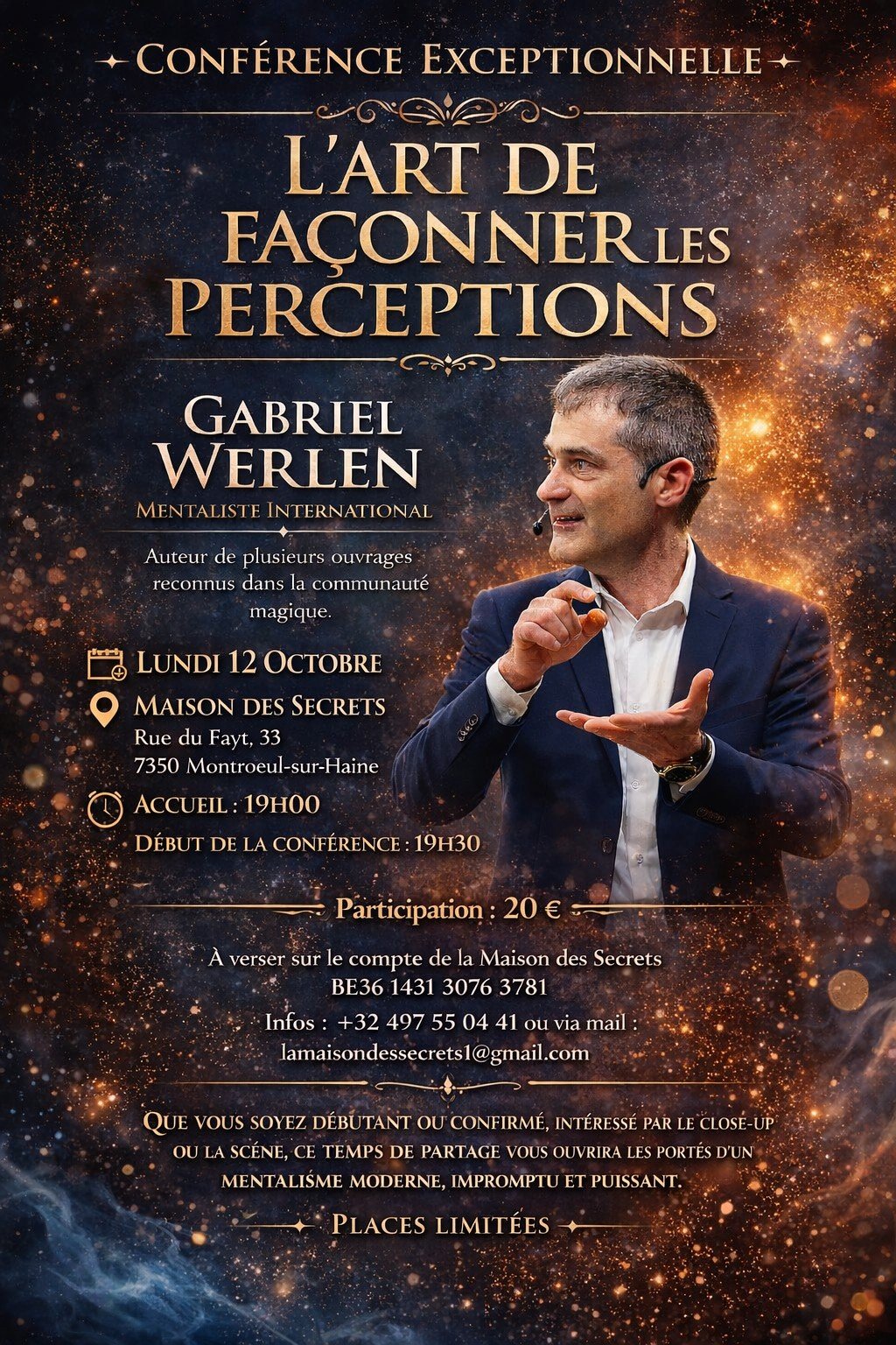 Au programme : une conférence captivante sur l’art de façonner les perceptions, suivie d’une masterclass intensive « De la théorie à la pratique ». Vous découvrirez des outils concrets, des routines prêtes à l’emploi et une vision moderne du mentalisme, immédiatement applicable en close-up comme sur scène.